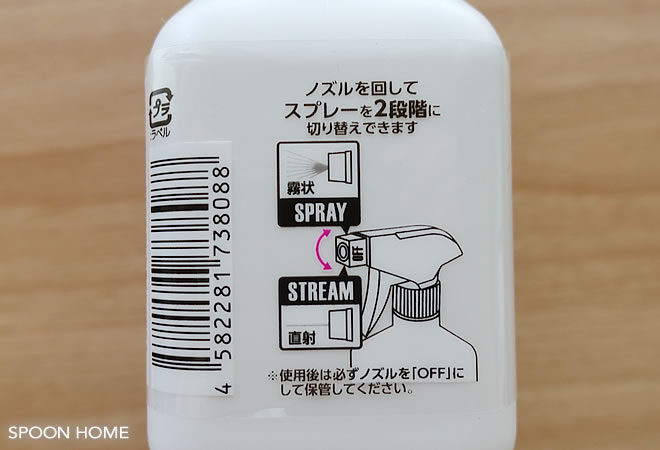 ノズルを回してスプレー方法を切り替えることができます。霧状と直射ができ、使用後はノズルをOFFの状態に。