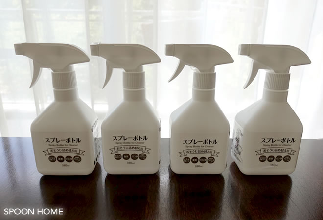 100円ショップのセリアでは、白色を基調としたシンプルなデザインの詰め替え容器を販売しています。お掃除用のスプレーボトルは人気が高く、品切れになっている店舗が多いです。