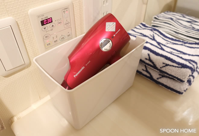 収納スペースが限られている洗面所では、スリムサイズが役立ちます。上の写真ではドライヤーをスリムサイズのストレージボックスに収納しました。