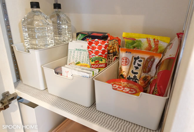 横幅が広く、程よい高さのレギュラーサイズは、食品収納に便利なボックスです。レギュラーサイズ2個とスリム1個をキッチン棚の整理で使用しています。