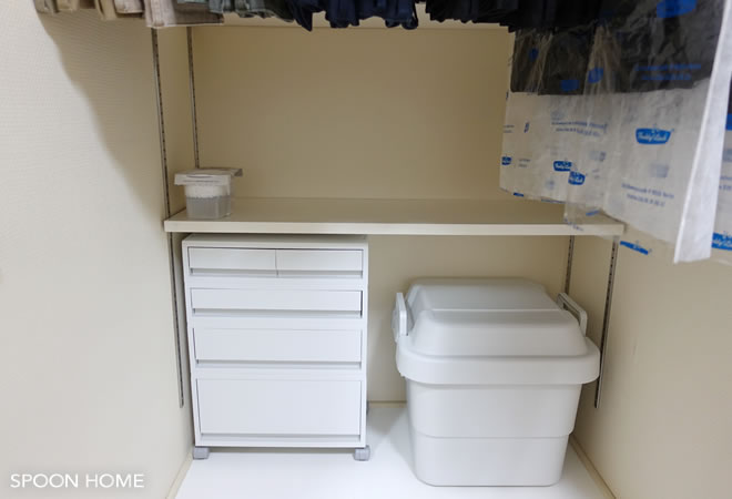 上の写真では、セリアで販売している「洗剤ケース」に箱ごと入れて使用しました。モノトーンデザイン同士で相性バッチリです。