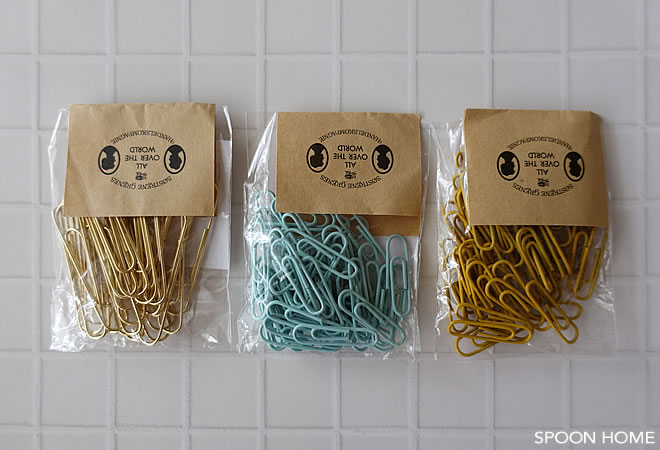 ゼムクリップは定番のシルバーだけでなく、ゴールドやイエロー、ブルーなどカラーバリエーションが豊富です。マットな色合いのゼムクリップを販売しており、カラー別に揃えたくなりました。