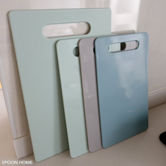 薄型のカッティングボードです。安い価格で購入できるので枚数を揃えやすく、食品の種類別に使い分けることができます。