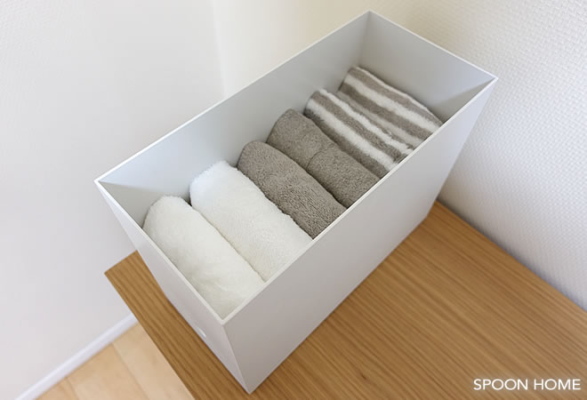上の写真では「ソフトボックス・長方形・小」の使用しました。フェイスタオルを立ててキレイに収納することができ、出し入れもしやすいです。