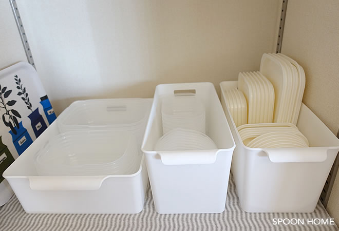 L型(左)とスリムL型(左)のライナケースに保存容器を立てて収納しています。白色の収納ケースは清潔感があり、キッチンを明るい印象にしてくれます。