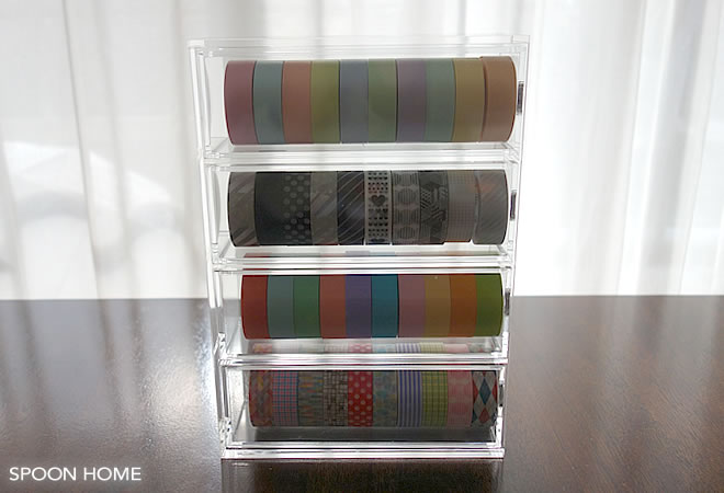 マスキングテープを引き出しに入れて収納したい場合は、こちらのアイテムが重宝します。しっかりと重さがある収納用品なので引き出しでもずれにくいのが特徴。透明タイプなので圧迫感が少なく、マスキングテープをキレイに見せることができます。